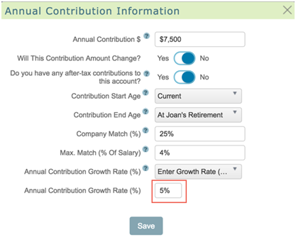But what happens if Joan follows some of our advice above, and makes it a habit to bump up her contributions 5% each year?