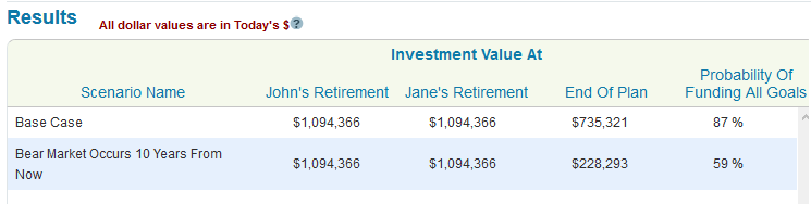 Keep in mind that this is a 55 year old couple. If this couple was younger, they surely would see much different results. Younger people should be taking more risk in their retirement portfolios since their time horizon is so much longer. They should then become more conservative as they get closer to retirement.