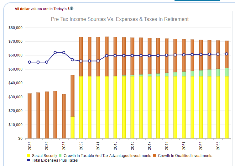 Using WealthTrace, you can view all of your sources of income through time and see if you can cover expenses each year in retirement.
