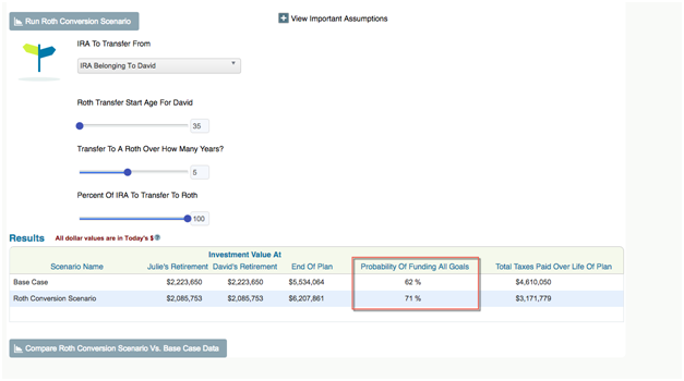 The WealthTrace Roth Conversion Scenario allows the couple to see what the effect of doing a transfer to a Roth might have on the probability of their plan's success. They can try different start ages for the transfer; specify the number of years over which to do the transfer (the laddering mentioned above); see if it makes sense to transfer all or part of the Roth; and then--and this is a feature unique to WealthTrace--run the new numbers through a Monte Carlo simulation.