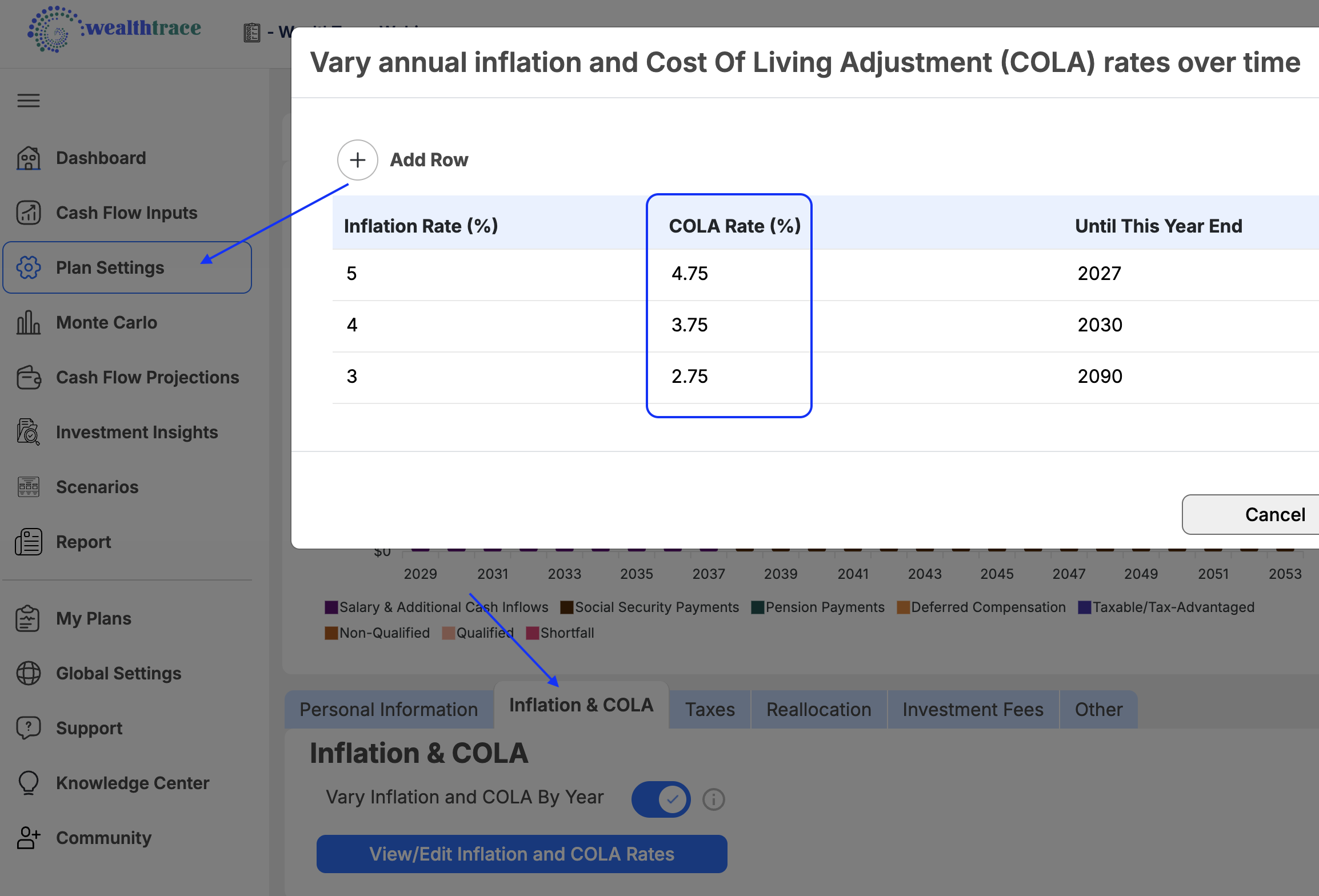 WealthTrace Planning Tip: You can adjust the COLA (cost-of-living adjustment) rate in your plan to model how Social Security benefits grow over time. You can choose a static rate or select to vary rates over time.