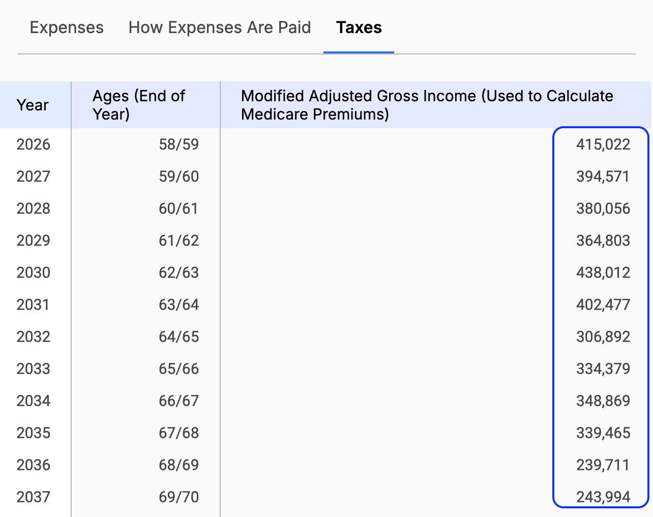 WealthTrace Planning Tip: Use scenario planning to model large financial events (like Roth conversions or asset sales) before executing them. Seeing the projected IRMAA impact two years ahead can help you spread income across years and avoid unnecessary premium increases.